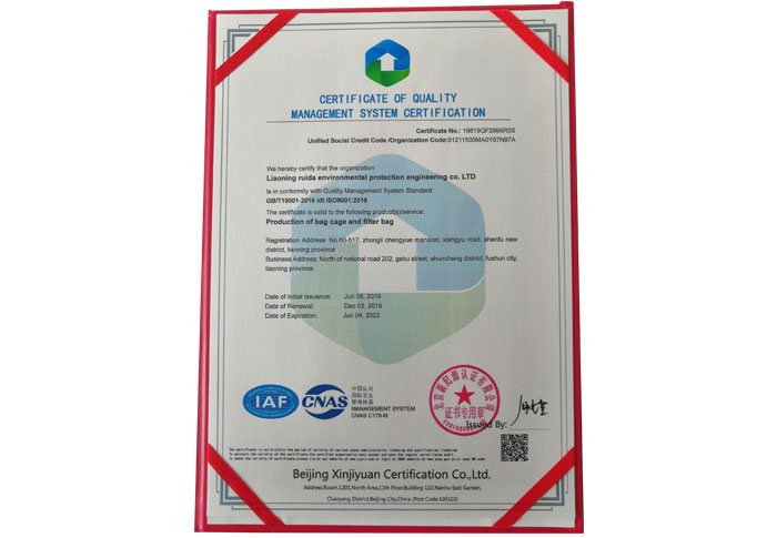 公司建筑面積約10000平方米,擁有多臺先進的濾袋、濾布、除塵骨架等設備。近年來公司重視自身建設,打造品牌意識,申請IS9001質量管理體系認證已經通過。